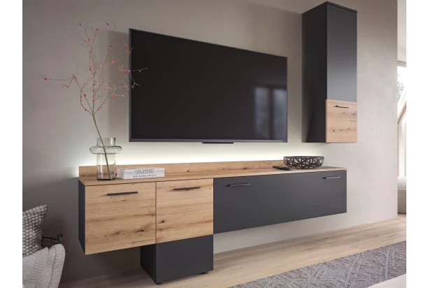 Moderná obývacia stena s nadčasovým šarmom. Štýlová kombinácia tmavosivej farby a útulného drevodekoru dub evoke dodáva tejto obývacej stene elegantný a zároveň prírodný vzhľad. Čisté línie, praktické úložné priestory a závesné prvky vytvárajú ľahký, moderný dojem, ktorý skvelo zapadne do mladistvého interiéru. Oceníte aj LED osvetlenie v chrbtovej lište, ktoré nasvieti zadnú stenu a vytvorí príjemnú večernú atmosféru. Táto obývacia stena je perfektným spojením funkčnosti a designu pre váš moderný obývací priestor.