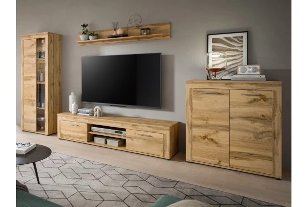 Obývacia stena z kolekcie Jana – nábytok v modernom nadčasovom štýle pôsobí elegantne a zároveň prakticky poslúži počas každého dňa. Priamočiare línie v útulnom drevodekore dub wotan navyše zvýrazňuje obľúbená optika širokých predných rámov. Tento nábytok je vyrobený z certifikovaného dreveného materiálu FSC® a je synonymom nielen pre kvalitu, ale aj pre udržateľnosť a ochranu životného prostredia. Obývacia zostava obsahuje celkom 4 diely: televízny stolík o šírke 160 cm, komodu 2dverovú, vysokú vitrínu na vystavenie vašich obľúbených predmetov a nástennú policu na stenu o šírke 140 cm. Táto zostava nábytku tak bude praktickou a zároveň estetickou súčasťou vášho moderného bytu.