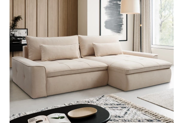 Rohová sedačka s dvojitými vankúšmi a dostatočným priestorom na pohodové ležérne sedenie a chvíle domácej pohody. Priestranný otoman je možné umiestniť na pravú alebo ľavú stranu – podľa vašej potreby. Sedačka s extra hlbokým sedákom je očalúnená látkou vo farbe krémová, ktorá je príjemne hebká na dotyk a zároveň odolná voči oderu a rozliatiu kvapalín. Výrazné prešitie aj látkové lemy dotvárajú moderný dizajn sedačky. Súčasťou sedačky je rozkladacia funkcia na lôžko aj praktický úložný priestor pod sedákom.