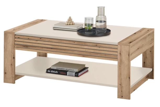 Obdĺžnikový konferenčný stolík o veľkosti 110×60 cm v kombinácii dub artisan s kašmírovo béžovými povrchmi a dekoračnými lamelami pôsobí veľmi útulne. Pri stolíku oceníte praktickú úložnú zásuvku, ktorá je nenápadne ukrytá v bočnom ráme a odkladaciu priehradku, kam ľahko odložíte časopisy, dennú tlač, knižku alebo ovládače.
