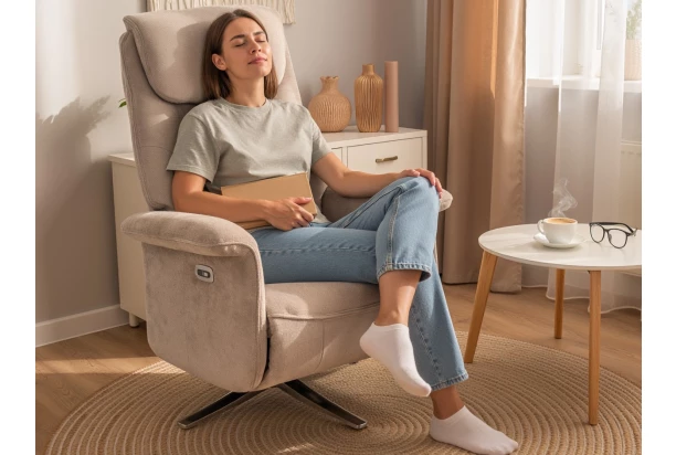 Moderné štýlové kreslo na stabilnej kovovej podnoži má relaxačnú funkciu elektrického polohovania, ktorú oceníte počas každodenného odpočinku. Komfortne čalúnené kreslo má anatomický tvar a poskytne oporu aj pre vyššie osoby. Je očalúnené príjemne mäkkou látkou v optike kože vo farbe béžová. Pomocou bočného tlačidla môžete ľahko polohovať sedák a postupne ho tak premeniť na relaxačné lehátko, ktoré využijete napríklad pri sledovaní televízie alebo behom chvíľ odpočinku. Navyše oceníte aj zabudovaný USB výstup, cez ktorý môžete počas relaxácie nabíjať napríklad smartfón alebo tablet.