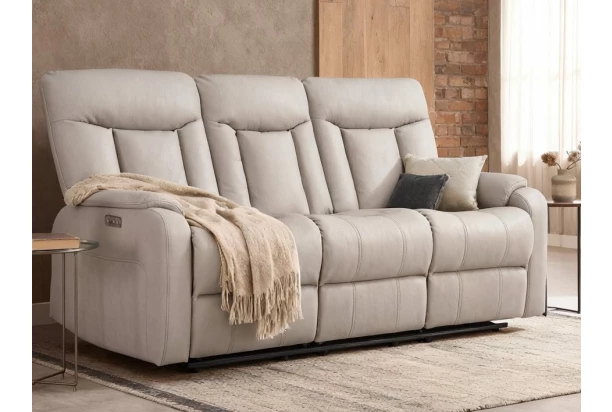 Trojmiestna pohovka s relaxačnou funkciou elektrického polohovania poskytne príjemné pohodlie počas každého dňa. Komfortne vypolstrované sedáky majú anatomický tvar a poskytnú oporu aj pre vyššie osoby. Gauč je očalúnený jemne štruktúrovanou látkou v optike kože vo farbe svetlo šedá. Pomocou bočných tlačidiel môžete ľahko polohovať bočné sedáky a premeniť ich tak napríklad na relaxačné lehátko, ktoré využijete napríklad pri sledovaní televízie alebo počas chvíľ odpočinku. Navyše oceníte aj zabudovaný USB výstup, cez ktorý môžete počas relaxácie nabíjať napríklad smartfón alebo tablet.
