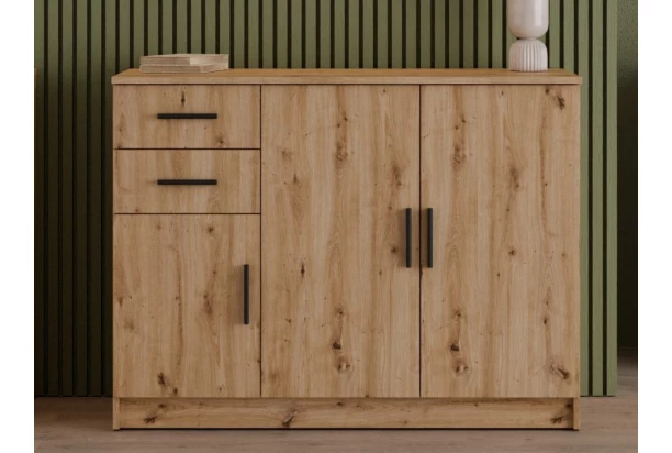 Komoda so šírkou 118 cm z modelového radu Universal obsahuje 3 dvere a 2 zásuvky. Je využiteľná v akejkoľvek miestnosti. V dekore dub artisan.