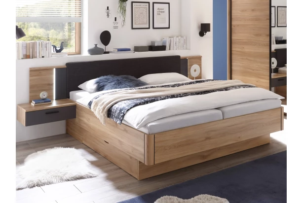 Posteľ s nočnými stolíkmi a osvetlením je vyrobená v útulnom drevodekore dub mauvella v kombinácii s grafitovou farbou a má veľkosti lôžka 180×200 cm. Čelo postele má štýlové látkové polstrovanie a pôsobivé LED nasvietenie, ktoré dotvára príjemnú večernú atmosféru v spálni. Zavesené nočné stolíky sú súčasťou zadného čela a pôsobia tak vzdušným dojmom – údržba podlahy pod nimi je navyše aj jednoduchšia. Oceníte aj bočné úložné zásuvky, do ktorých ľahko uložíte posteľnú bielizeň, lôžkoviny, deky alebo napríklad veci sezónnej potreby.