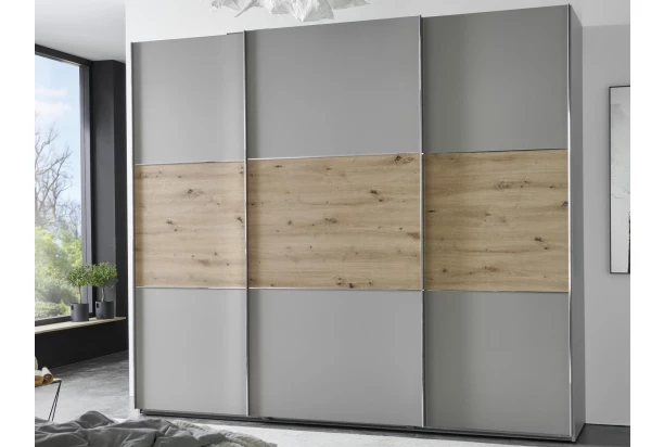 Moderná šatníková skriňa so šírkou 250 cm je vyrobená v kombinácii šedá sahara s útulným drevodekorom dub artisan. Lesklé kovové úchyty a horizontálne línie predných plôch vytvárajú luxusný efekt. Táto skriňa má 3 posuvné dvere, ktoré sa ľahko otvárajú a navyše sú vybavené mechanizmom s tichým dovieraním. Vnútri skrine nájdete tri vnútorné bloky s bohatou vnútornou výbavou, ktoré obsahujú police, šatníkové tyče aj šuplíky na drobnú bielizeň. Šatníková skriňa tak obsahuje všetko pre praktické a prehľadné ukladanie všetkého oblečenia. Táto šatníková skriňa prakticky poslúži a zároveň vytvorí útulné prostredie v každej moderne zariadenej spálni, šatni alebo napríklad chodbe.