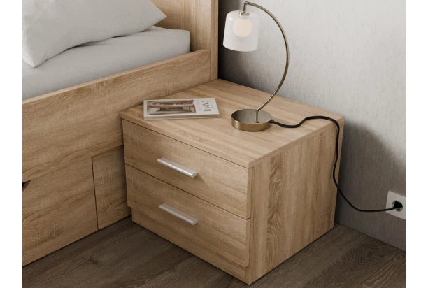 Nočný stolík s 2 zásuvkami má šírku 46 cm a je vyrobený v dekore dub sonoma. Vďaka nadčasovom štýle a hodí sa kombinovať k akejkoľvek posteli.