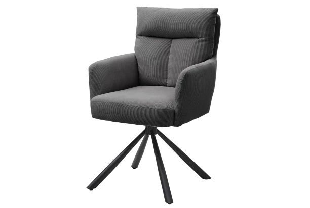 Luxusná jedálenská stolička má komfortne mäkkučké pružinové sedenie a elegantný dizajn v vankúšovej optike. Sedák stoličky je otočný o 180 ° a čierna kovová podnož v kónickom tvare poskytuje stabilitu. Stolička je očalúnená mäkkou štruktúrovanou látkou vo farbe šedá, ktorá dotvára útulnú atmosféru v priestore jedálne. Táto stolička dokonale vynikne v modernom priestore jedálne.