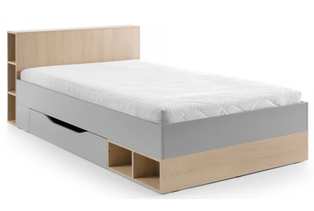 Posteľ z kolekcie Room – moderný nábytok v harmonickej kombinácii matná šedá s útulným dubovým dekorom pasuje univerzálne do každej detskej či študentskej izby. Posteľ o veľkosti lôžka 120×200 cm obsahuje praktický výsuvný šuplík na uloženie lôžkovín či sezónnych vecí. Vysoké čelo s regálmi slúži ako opora pri čítaní aj miesto pre knihy a dekorácie, zatiaľ čo spodné priehradky poskytujú ďalší úložný priestor.
