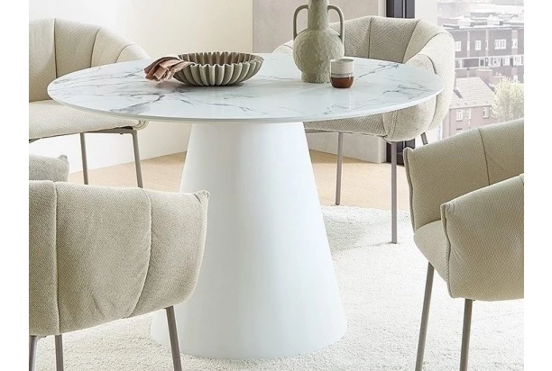 Okrúhly jedálenský stôl v imitácii bieleho mramoru má priemer 120 cm a dokonale sa hodí do moderne zariadeného interiéru. Moderný dizajn stola dotvára biela podnož v tvare kužeľa, ktorá mu dodáva stabilitu počas každodenného používania. Skosené bočné hrany jedálenskej dosky sú zaujímavým detailom. Tento okrúhly stôl skvele vynikne vedľa moderného nábytku, ale aj ako solitér so stoličkami uprostred miestnosti.