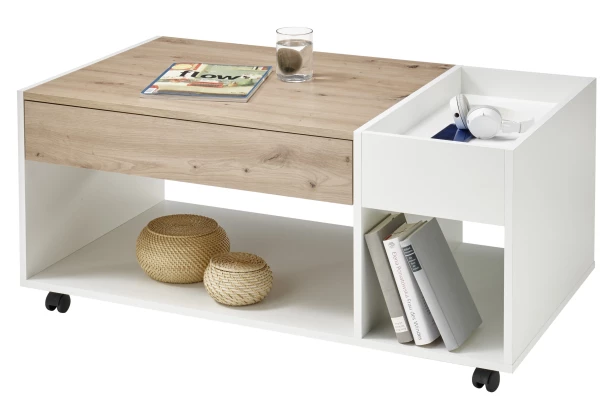 Tento praktický konferenčný stolík na kolieskach obsahuje úložný šuplík a priehradky na prehľadné odkladanie časopisov, novín alebo knižky. Vyrobený v kombinácii biela/dub artisan a vďaka konštrukcii na kolieskach ho môžete ľahko presunúť. Vedľa hornej plochy nájdete navyše ďalšiu priehradku, kam môžete odkladať napríklad diaľkové ovládače.