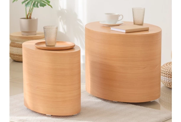 Sada 2 kusov rôzne veľkých stolíkov v trendovom oválnom tvare je vyrobená vo svetlom bukovom dekore a v modernom interiéri bude tvoriť atraktívnu spoločnú kompozíciu vedľa sedačky. Stolíky môžete umiestniť vedľa seba alebo ich ľubovoľne rozmiestniť v interiéri. Malý stolík môžete využiť aj samostatne na odkladanie ovládača, smartfónu, na umiestnenie lampičky alebo napríklad kvetov – záleží ich na vás.