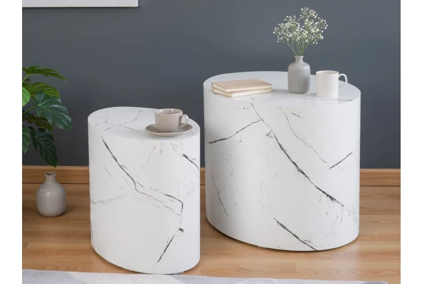 Súprava 2 kusov rôzne veľkých stolíkov v trendovom oválnom tvare je vyrobená v imitácii bieleho mramoru a v modernom interiéri bude tvoriť atraktívnu spoločnú kompozíciu vedľa sedačky. Stolíky môžete umiestniť vedľa seba alebo ich ľubovoľne rozmiestniť v interiéri. Malý stolík môžete využiť aj samostatne na odkladanie ovládača, smartfónu, na umiestnenie lampičky alebo napríklad kvetov – záleží ich na vás.