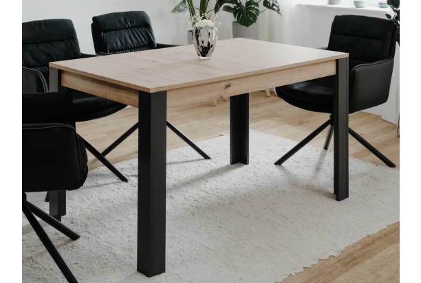 Obdĺžnikový jedálenský stôl s veľkosťou 100×80 cm je vyrobený v útulnom drevodekore dub artisan s kontrastne čiernymi nohami. Plochu stola je možné rozšíriť na 150 cm vďaka rozkladacej funkcii a vy tak budete môcť usadiť k stolu viac osôb. Tento stôl má úplne univerzálny dizajn a dobre tak pasuje do priestoru modernej aj klasicky zariadenej jedálne.