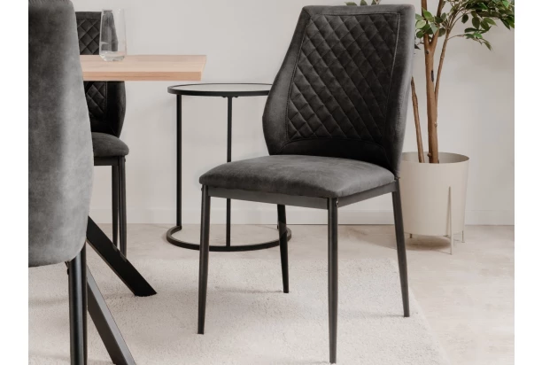 Moderná jedálenská stolička na čiernej kovovej podnoži má pohodlne tvarované operadlo s elegantným okrasným prešivom. Stolička je očalúnená antracitovou látkou vo vintage optike brúsenej kože, ktorá spolu s prešívaním zaujme na pohľad. Táto pohodlná stolička dobre pasuje k akémukoľvek typu stola.
