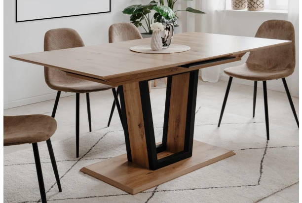 Priestranný jedálenský stôl s veľkosťou 160×90 cm je možné predĺžiť na dĺžku 200 cm vďaka rozkladacej funkcii so synchrónnym mechanizmom. Navyše zaujme moderným designem. Priestranný jedálenský stôl s veľkosťou 160×90 cm je možné predĺžiť na dĺžku 200 cm vďaka rozkladacej funkcii so synchrónnym mechanizmom – môžete tak pozvať k stolu celú rodinu alebo ďalších priateľov. Stôl v obdĺžnikovom tvare je vyrobený v kombinácii drevodekoru dub artisan s kontrastne čiernou farbou. Stôl si obľúbite nielen pre jeho praktickosť, ale aj pre jeho moderný dizajn. Široká podnož kombinovaná čiernym kovom zaujme na pohľad a zároveň zaisťuje veľmi dobrú stabilitu stola počas jeho používania. Tento stôl sa tak stane výrazným stredobodom vášho interiéru.