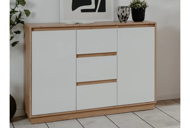 Komoda so šuplíkmi so šírkou 117 cm z radu Dallas má jednoducho moderný štýl, ktorý sa hodí do každého moderného interiéru a zachováva si nadčasovosť. Táto komoda s bezúchytovým otváraním má 3 šuplíky a 2 otočné dvere s úložným priestorom pre všestranné ukladanie akýchkoľvek vecí. Vyrobená v kombinácii drevodekoru dub artisan s lesklo bielymi prednými plochami.