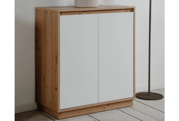 Skrinka so šírkou 79 cm z radu Dallas má jednoducho moderný štýl, ktorý sa hodí do každého moderného interiéru a zachováva si nadčasovosť. Táto komoda s bezúchytovým otváraním má 2 otočné dvere s úložným priestorom pre všestranné ukladanie akýchkoľvek vecí. Vyrobená v kombinácii drevodekoru dub artisan s lesklo bielymi prednými plochami.