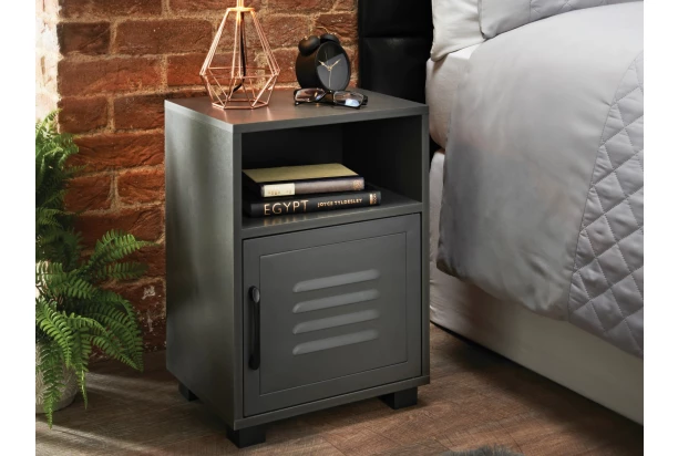 Tmavosivý nočný stolík v industriálnom štýle má otvorenú odkladaciu priehradku a kovové dvierka s úložným priestorom, ktoré podtrhujú originálny dizajn. Stolík na nožičkách bude perfektne pasovať do modernej štýlovej spálne, prípadne poslúži aj kdekoľvek inde ako klasická malá odkladacia skrinka.