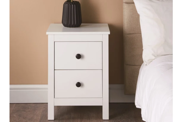 Biely nočný stolík v tradičnom štýle má 2 praktické zásuvky s čiernym zaguľateným úchytom. Tento stolík so svojou šírkou 39 cm je vhodný aj do malého priestoru. Naopak vďaka výške 54 cm je možné umiestniť aj k vyššiemu lôžku. Optikou sa hodí do klasického, vidieckeho alebo romantického interiéru spálne alebo aj obývačky, kde poslúži ako malá odkladacia skrinka.
