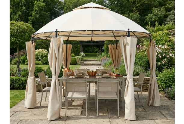 Doprajte svojej záhrade nádych elegancie a vytvorte si dokonalé miesto na oddych aj spoločné stretnutia. Okruhlý záhradný altánok s priemerom 350 cm zaujme okrasným kovovým výpletom, ktorý mu dodáva romantický a nadčasový charakter. Stabilný kovový rám zaisťuje pevnosť a dlhú životnosť, zatiaľ čo praktické bočné závesy z béžovej látky Vás príjemne ochránia pred slnečnými lúčmi aj ľahkým vetrom. Vďaka nim si môžete ľahko vytvoriť viac súkromia a prispôsobiť atmosféru podľa aktuálnej nálady. Dostatočný priestor pod altánkom pre záhradný nábytok aj väčšie posedenie, takže tu najde miesto celá rodina aj priatelia počas letných oslav, grilovania, pokojnej relaxácie či pri spoločnom stretnutí pri popoludňajšej káve. Tento béžový altánok je štýlový, praktický a neprehliadnuteľný doplnok, ktorý premení každú záhradu na príjemné útočisko pre chvíle plné pohody.