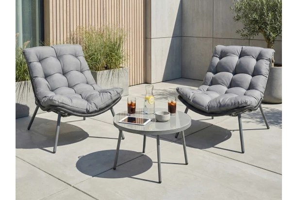 Vychutnajte si chvíle pokoja a odpočinku s týmto 3dielnym záhradným setom, ktorý obsahuje okrúhly kávový stolík a 2 kreslá. Dve pohodlné kresielka s mäkkými šedými poduškami ponúkajú pohodové posedenie pri rannej káve aj večernom odpočinku. Malý okrúhly stolík s hornou plochou zo šedého tvrdeného skla pôsobí elegantne a zároveň prakticky – poskytne dostatok priestoru pre šálky s kávou, poháre s čerstvou šťavou aj drobné občerstvenie. Vďaka kompaktným rozmerom sa set skvele hodí nielen na záhradu, ale aj na terasu, k bazénu alebo na balkón. Vytvorte si tak útulný kút, kde si budete môcť každý deň dopriať zaslúžený odpočinok. Konštrukcia z kovu zaisťuje stabilitu a výplet z odolnej imitácie ratanu dobre odoláva vonkajším poveternostným vplyvom.