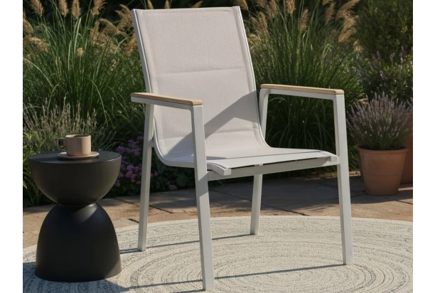Elegantné záhradné kreslo v imitácii prírodného dreva s jemne béžovým kovom prepája moderný design s hrejivým dojmom prírody. Nadčasové línie, vzdušná konštrukcia a harmonické farebné ladenie dokonale zapadnú do každej záhrady, na terasu aj balkón. Pohodlne tvarovaný sedák v imitácii umelej tkaniny je odolný voči vonkajším vplyvom a poskytuje príjemné pohodlie počas sedenia.