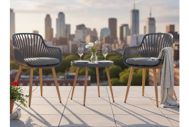 Vytvorte si príjemné miesto na oddych aj na menšom priestore s kompaktným 3 dielnym záhradným setom. Súprava nábytku sa skladá z okrúhleho odkladacieho stolíka a dvoch pohodlných kresielok, ktoré spoločne vytvoria ideálne zákutia pre rannú kávu, popoludňajší relax aj večerné posedenie vo dvojici. Kombinácia kovu a odolného polypropylénového plastu zaisťuje dlhú životnosť a jednoduchú údržbu, vďaka použitým materiálom je set vhodný na vonkajšie využitie a bez obáv zapadne do prostredia záhrady, terasy aj balkóna. Svojimi rozmermi sa hodí nielen do každého kúta záhrady či terasy, ale aj na menší balkón, kde pomôže vytvoriť útulné a svieže miesto na chvíle pohody na čerstvom vzduchu. Praktické, štýlové a priestorovo nenáročné riešenie pre každodenné chvíle pohody.