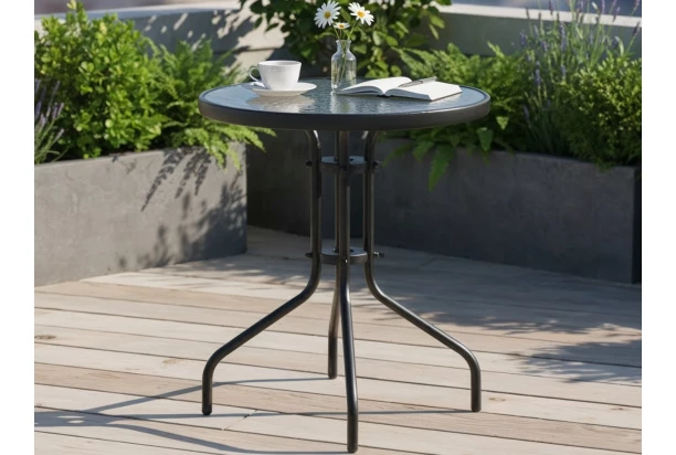 Malý okrúhly záhradný stôl s priemerom 60 cm má stabilnú konštrukciu z kombinácie čierneho kovu a tvrdeného skla. Pasuje na záhradu aj malý balkón. Tvrdené sklo má zo spodnej strany okrasnú štruktúru, ktorá vytvára motív vodnej hladiny. Tento záhradný stolík ľahko skombinujete s akýmikoľvek záhradnými stoličkami z kovu alebo zostavou kovového záhradného nábytku.