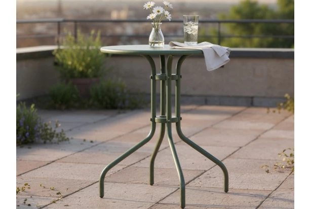 Malý okrúhly záhradný stôl s priemerom 60 cm má stabilnú konštrukciu zo zeleného kovu a skvele tak splynie s vonkajším prostredím. Pasuje na záhradu aj malý balkón.