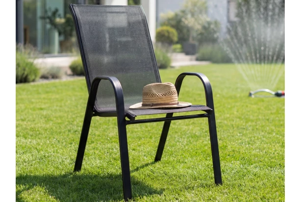 Moderná záhradná stolička so zaoblenou kovovou konštrukciou a podrúčkami poslúži pri záhradnom stole alebo aj samostatne. Sedacie časti sú vyrobené z čiernej umelej tkaniny, ktorá je odolná voči vplyvom vonkajšieho prostredia. Pri tomto záhradnom kresle je možné stohovať viac kusov na seba a ušetriť tak okolitý priestor pri skladovaní.