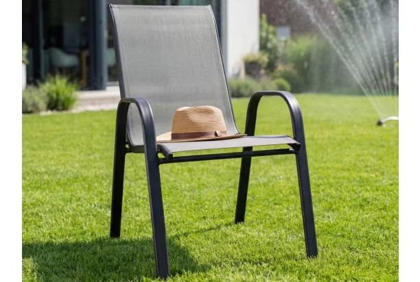 Moderná záhradná stolička so zaoblenou kovovou konštrukciou a podrúčkami poslúži pri záhradnom stole alebo aj samostatne. Sedacie časti sú vyrobené zo šedej umelej tkaniny, ktoré sú odolné voči vplyvom vonkajšieho prostredia. Pri tomto záhradnom kresle je možné stohovať viac kusov na seba a ušetriť tak okolitý priestor pri skladovaní.