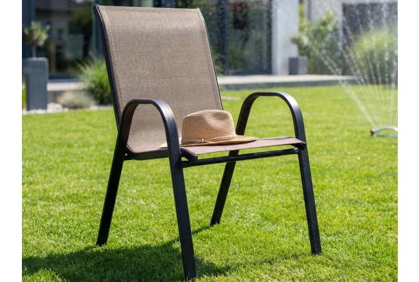 Moderná záhradná stolička so zaoblenou kovovou konštrukciou a podrúčkami poslúži pri záhradnom stole alebo aj samostatne. Sedacie časti vyrobené z hnedej umelej tkaniny, ktoré sú odolné voči vplyvom vonkajšieho prostredia. Pri tomto záhradnom kresle je možné stohovať viac kusov na seba a ušetriť tak okolitý priestor pri skladovaní.