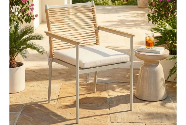Štýlová záhradná stolička s podrúčkami v imitácii prírodného dreva a umelej imitácii ratanu s jemne béžovým kovom prepája moderný dizajn s hrejivým dojmom prírody. Vzdušná optika konštrukcie a harmonické farebné ladenie dokonale zapadnú do každej záhrady, na terasu alebo balkón. Sedák je doplnený béžovým sedacím vankúšom, ktorý poskytuje príjemne mäkké sedenie.