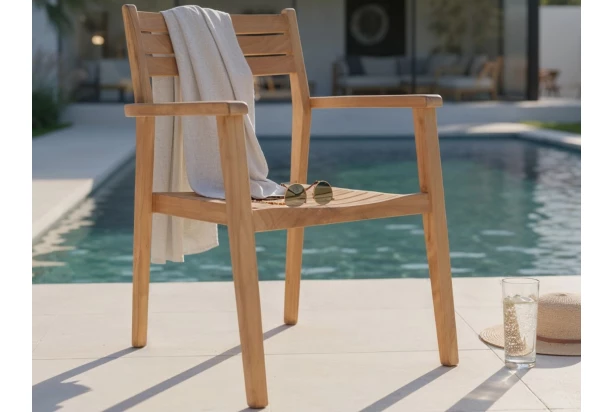 Záhradná stolička s podrúčkami z kvalitného teakového dreva predstavuje ideálnu voľbu pre všetkých, ktorí hľadajú spojenie prírodnej krásy, funkčnosti a dlhej životnosti. Jej nadčasový dizajn prirodzene zapadne do prostredia záhrady aj terasy a vytvorí harmonické miesto na rodinné obedy, letné grilovanie i posedenie s priateľmi. Táto záhradná jedálenská stolička poslúži buď samostatne alebo spoločne pri jedálenskom stole, kde si príjemne posedíte počas rodinného obeda, letného grilovania aj posedenia s priateľmi. Teakové drevo je cenené pre svoju mimoriadnu tvrdosť, vysokú odolnosť voči vlhkosti, slnečnému žiareniu i zmenám teplôt, vďaka tomu ich sa vyznačuje dlhou životnosťou a to aj pri pravidelnom vonkajšom používaní.