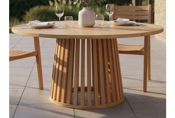 Okrúhly záhradný jedálenský stôl s priemerom 120 cm je vyrobený z teakového dreva a zaujme atraktívnym lamelovým dizajnom podstavy v kónickom tvare. Sk. Môžete ho ľahko kombinovať so záhradnými stoličkami z teakového dreva, ale aj napríklad s kovovými. Jedálenský stôl z teakového dreva je ideálnou voľbou pre všetkých, ktorí hľadajú spojenie prírodnej krásy, funkčnosti a dlhej životnosti. Vďaka prírodnému materiálu skvelo zapadne do vonkajšieho prostredia. Teakové drevo je cenené pre svoju mimoriadnu tvrdosť, vysokú odolnosť voči vlhkosti, slnečnému žiareniu i zmenám teplôt, vďaka tomu ich sa vyznačuje dlhou životnosťou a to aj pri pravidelnom vonkajšom používaní.
