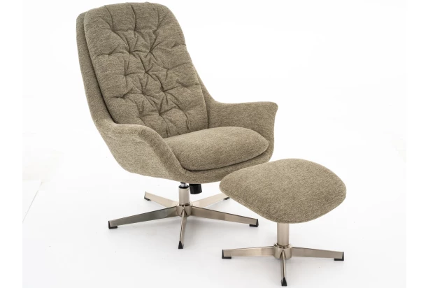 Hojdacie kreslo s podnožkou je očalúnené zelenou látkou a doplnené štýlovým prešivom. Poskytne pohodové posedenie počas každého dňa. Sedák má otočný o 360 stupňov a taburet pod nohy dopĺňa príjemný relax. Kovová podnož v brúsenej optike poskytuje kreslu potrebnú stabilitu počas každodenného využívania.