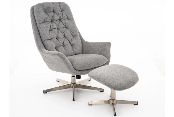 Hojdacie kreslo s podnožkou je očalúnené holubou šedou látkou a doplnené štýlovým prešivom. Poskytne pohodové posedenie počas každého dňa. Sedák má otočný o 360 stupňov a taburet pod nohy dopĺňa príjemný relax. Kovová podnož v brúsenej optike poskytuje kreslu potrebnú stabilitu počas každodenného využívania.
