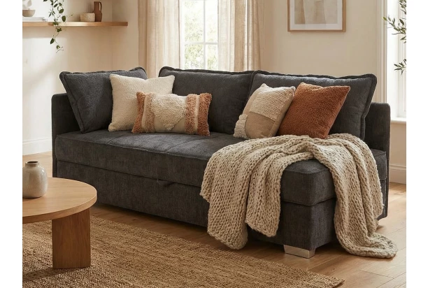 Táto praktická pohovka s tromi veľkými opornými vankúšmi je očalúnená mäkkou žinilkovou látkou vo farbe dymovo šedá a okrem bežného sedenia môže byť využitá na príležitostné alebo aj trvalé spanie. Pod sedákom ukrýva praktický úložný priestor, kam je možné uschovať lôžkoviny alebo napríklad veci, ktoré práve nepoužívate. Bočnú opierku je možné univerzálne namontovať na pravú alebo ľavú stranu a pohovku si tak ľahko prispôsobiť podľa vašej potreby.