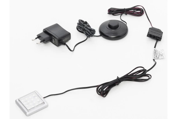 Osvetlenie obsahuje 1 kus bodového LED svetlá pre univerzálne nasvietenie vitrín, políc či akýchkoľvek podhľadov nábytku. Farba svetla studená biela. Vrátane trafa, kábla a vypínača.