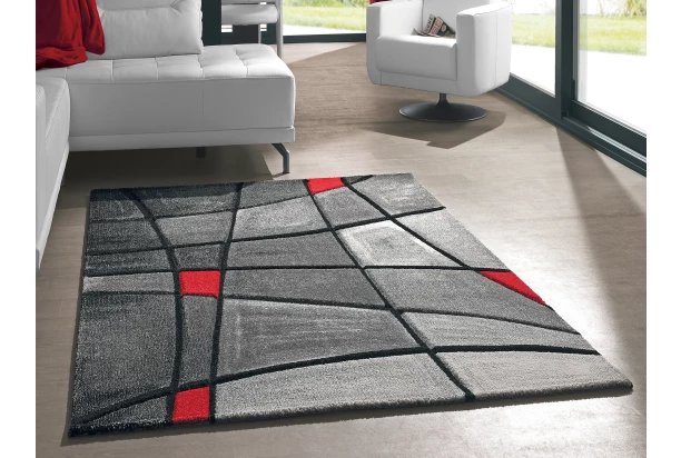 Krásny koberec s pôsobivým geometrickým vzorom. Farba sivá / čierna / červená. Rozmer 160×230 cm.