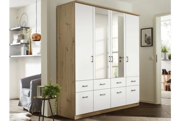 Šatníková skriňa so zrkadlami o šírke 181 cm z programu Bremen je obľúbená pre svoju praktickosť a dobré spracovanie. Vyrobená v dekore dub artisan/biela. Ponúka úložné priestory za 4 otočnými dverami a 8 zásuviek na prehľadné ukladanie oblečenia, bielizne a doplnkov. Z jednotlivých elementov série Bremen môžete navyše zostaviť ľubovoľne veľký šatník a prispôsobiť si tak úložné priestory podľa individuálnych potrieb.