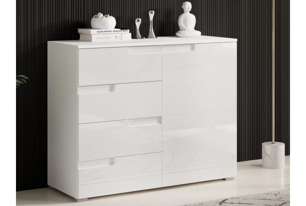 Skrinka z radu Spice sa vyznačuje lesklými bielymi povrchmi s extravagantnou profiláciou a ideálne sa hodí do nadčasovo zariadeného bytu. Obsahuje 4 zásuvky a 1 dvere.