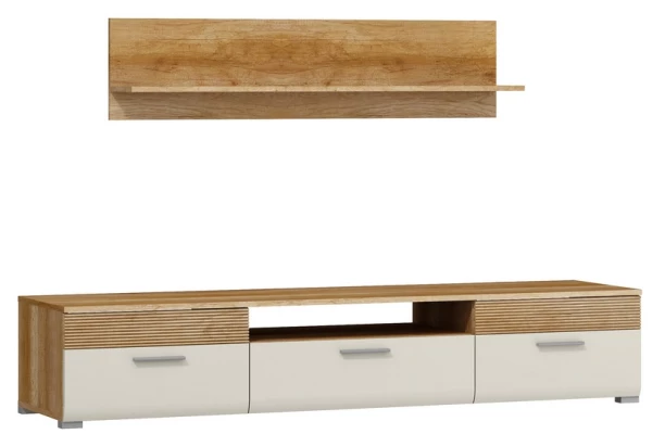 Trendový program Luigi zaujme dekoratívnym frézovaním svojich plôch a tiež prirodzenou kresbou medového duba. TV stolík s nástennou policou.