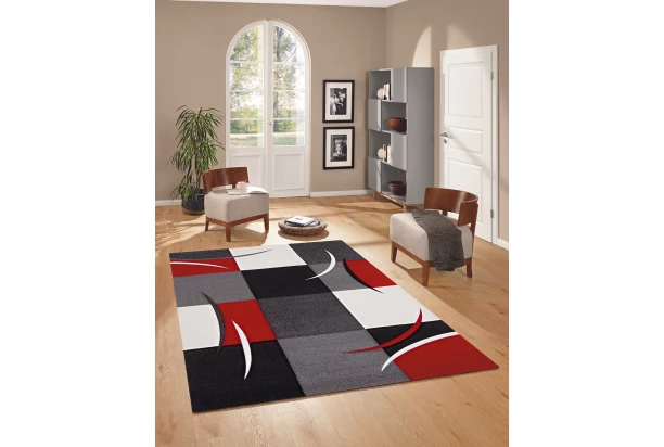 Koberec s moderným vzorom zvýrazní podlahu. Farba šedá/čierna/krémová/červená. Rozmer 160×230 cm.