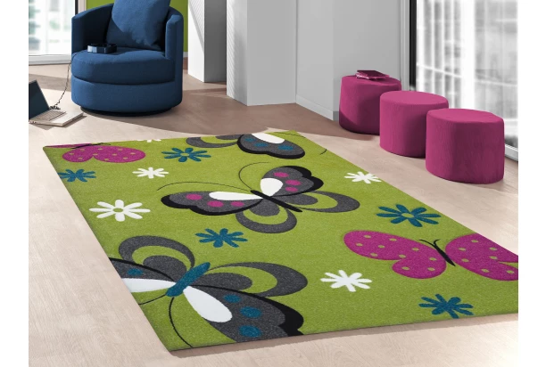 Krásny zelený koberec so vzorom farebných motýľov a kvetov sa hodí nielen do detskej izby. Rozmer 120×170 cm.