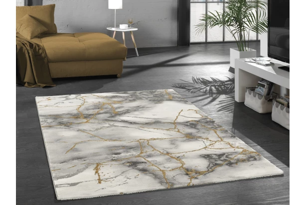 Koberec obdĺžnikový rozmer 80×150 cm s nízkym a príjemne hustým vlasom. Štýlový šedo-zlatý design v mramorovej optike sa dokonale hodí do moderne zariadeného bytu.
