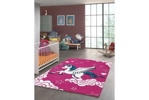 Krásny koberec so vzorom lietajúceho jednorožca a hviezdičiek sa hodí nielen do detskej izby. Rozmer 120×170 cm.