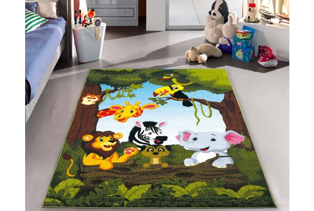 Detský zelený koberec s motívom veselých zvieratiek v džungli si obľúbia chlapci aj dievčatá. Tento koberec vnesie do detskej izby dobrú náladu a zábavu. Rozmer 80×150 cm.