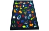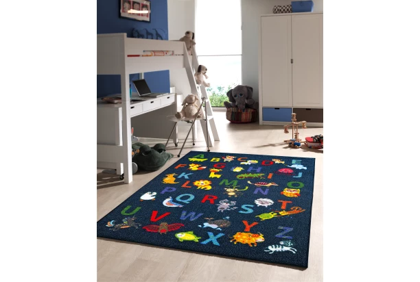 Detský modrý koberec s motívom abecedy je nielen nádherný, ale aj poučný. Farebné písmenká navyše dopĺňajú veselé zvieratká. Rozmer 80×150 cm.