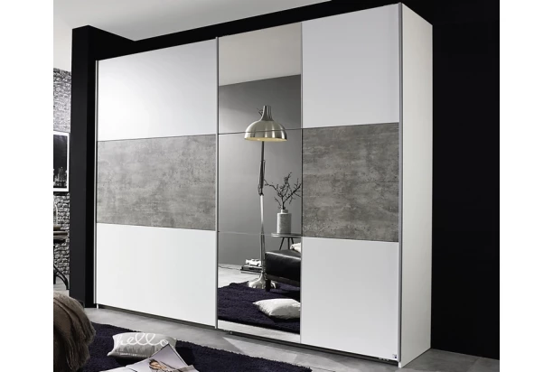 Moderná šatníková skriňa so šírkou 218 cm s posuvnými dverami. Biele plochy sú kombinované pruhy zrkadlá a imitáciou šedého betónu – spoločne tak vytvára veľmi zaujímavú optiku do moderne ladenej spálne či šatne.